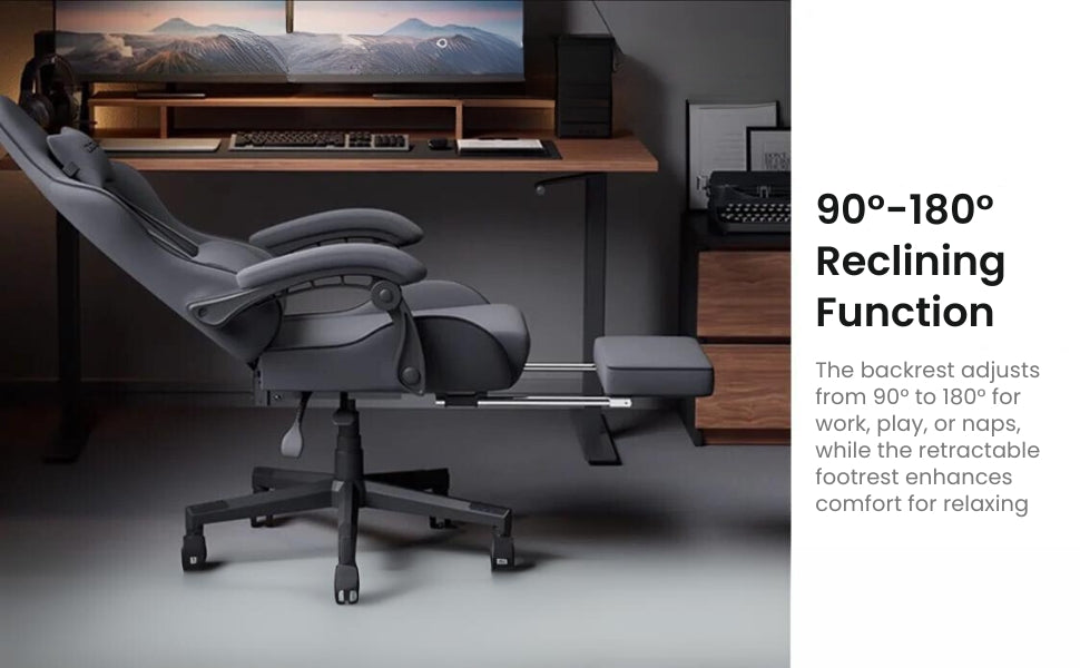 - This gaming chair is equipped with an adjustable headrest and lumbar support cushion, designed to relieve neck and back pain during long gaming or work sessions. The ergonomic design ensures that your posture is maintained, reducing the risk of discomfort